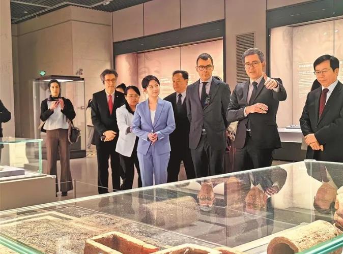 盧森堡駐華大使盧睿朗(右三)一行走進“小而美——盧森堡文物精品展”現(xiàn)場。