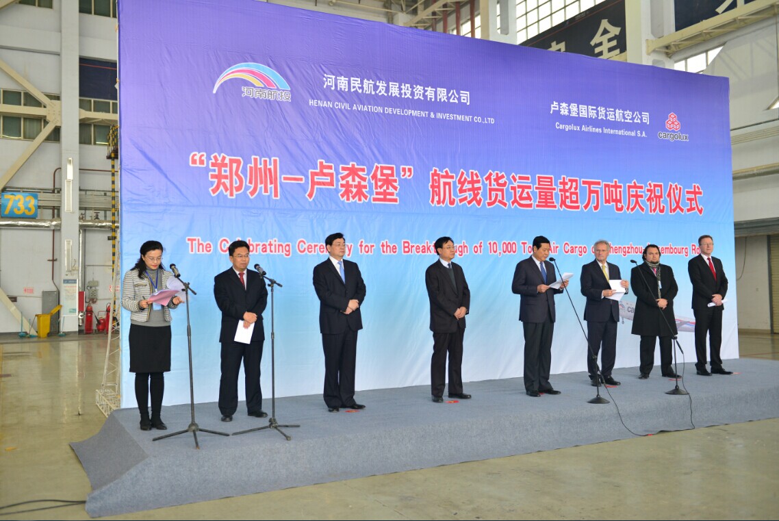 河南省副省長趙建才參加儀式并致辭,他指出,“鄭州-盧森堡”國際貨運航線架起了橫貫中歐大陸的“空中絲綢之路”?!耙宦凤w跨中歐,天塹變通途”,截至今日,該航線累計貨運量已突破萬噸,為鄭州國際機場貨運量的快速提升作出了突出貢獻!這一成績的取得,是河南省與盧貨航優(yōu)勢互補、合作共贏的成功典范,更是“雙樞紐”戰(zhàn)略推動實驗區(qū)發(fā)展的生動實踐。當(dāng)前,鄭州航空港經(jīng)濟綜合實驗區(qū)發(fā)展態(tài)勢良好,希望盧貨航與河南航投搶抓實驗區(qū)戰(zhàn)略機遇,不斷拓寬合作領(lǐng)域,豐富合作內(nèi)容,加快推動合資貨航組建和飛機維修基地建設(shè),積極培育參與國際分工合作新優(yōu)勢,努力促進鄭州與盧森堡乃至歐亞之間的經(jīng)貿(mào)合作和人文交流,為建設(shè)鄭州航空港經(jīng)濟綜合實驗區(qū)做出新的更大的貢獻。
