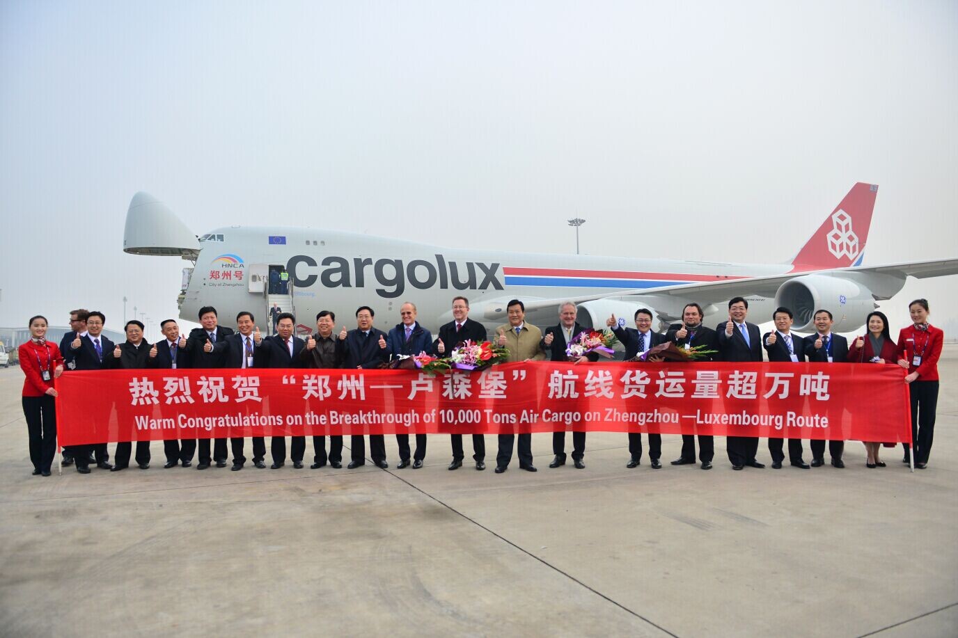 為慶祝洲際新航線的喜人佳績,鄭、盧兩地均舉行了簡單而熱烈的紀念活動。當(dāng)?shù)貢r間22日下午5點,在芬德爾機場舉行了“貨運超萬噸航班起航儀式”,盧森堡可持續(xù)發(fā)展與基礎(chǔ)產(chǎn)業(yè)部部長弗朗索瓦?鮑施、中國駐盧森堡大使曾憲柒以及盧貨航董事會主席保羅?海明格、CEO德克?李奇、高級副總裁兼財務(wù)總監(jiān)理查德?福森參加。之后,保羅?海明格、德克?李奇、理查德?福森特意搭乘“鄭州號”飛抵鄭州,參加中方23日下午舉行的“貨運超萬噸航班接機儀式”。
