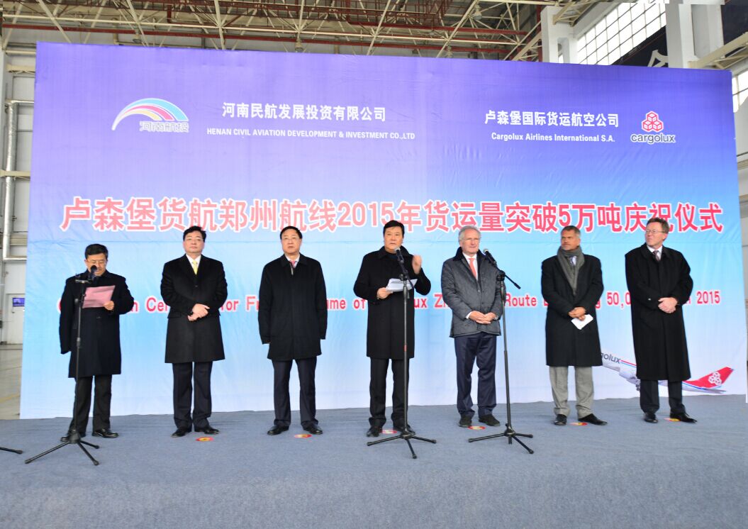 當(dāng)天中午,河南民航發(fā)展投資有限公司與盧貨航聯(lián)合在鄭州機(jī)場舉行了簡短熱烈的慶祝儀式。河南省副省長趙建才出席儀式并致辭,盧森堡駐華大使石泰嵋宣讀盧森堡可持續(xù)發(fā)展與基礎(chǔ)產(chǎn)業(yè)部部長弗朗索瓦?鮑施的賀信,省政府副秘書長張雷明主持儀式。省直單位有關(guān)負(fù)責(zé)人親臨現(xiàn)場。河南航投董事長、黨委書記張明超,總經(jīng)理、副董事長、黨委副書記劉建葆,公司領(lǐng)導(dǎo)悅國勇、鄭立亮、郭艷紅以及盧貨航董事會主席保羅?海明格、盧貨航總裁兼CEO德克?李奇同時參加儀式。