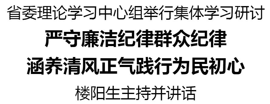 6月7日,省委理論學(xué)習(xí)中心組舉行集體學(xué)習(xí)研討,繼續(xù)深入學(xué)習(xí)《中國(guó)共產(chǎn)黨紀(jì)律處分條例》,重點(diǎn)圍繞廉潔紀(jì)律、群眾紀(jì)律進(jìn)行研讀。省委書記樓陽(yáng)生主持并講話。
